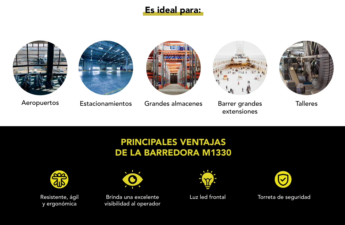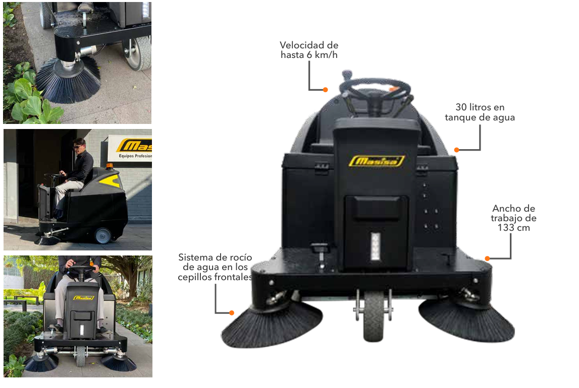 Productividad máxima de trabajoHata 5,200m2/hAutonomía por ciclo de carga4.5 horasAlimentación del Cargador120vca a 50/60HzBaterías2 Baterías recargables tipo AGM 12V@115ahAncho de Trabajo130cmAncho de Cepillo Natural70cmAncho de Cepillo Lateral30cm x 2Velocidad de AvanceHasta 4km/hPendiente Máxima18%Capacidad de Tolva100 LitrosDeposito de Agua30 litrosSuperficie de Filtración6m2Nivel de Ruido68dBPeso Neto sin Baterías225kgDimensiones1.40x1.01x1.20m